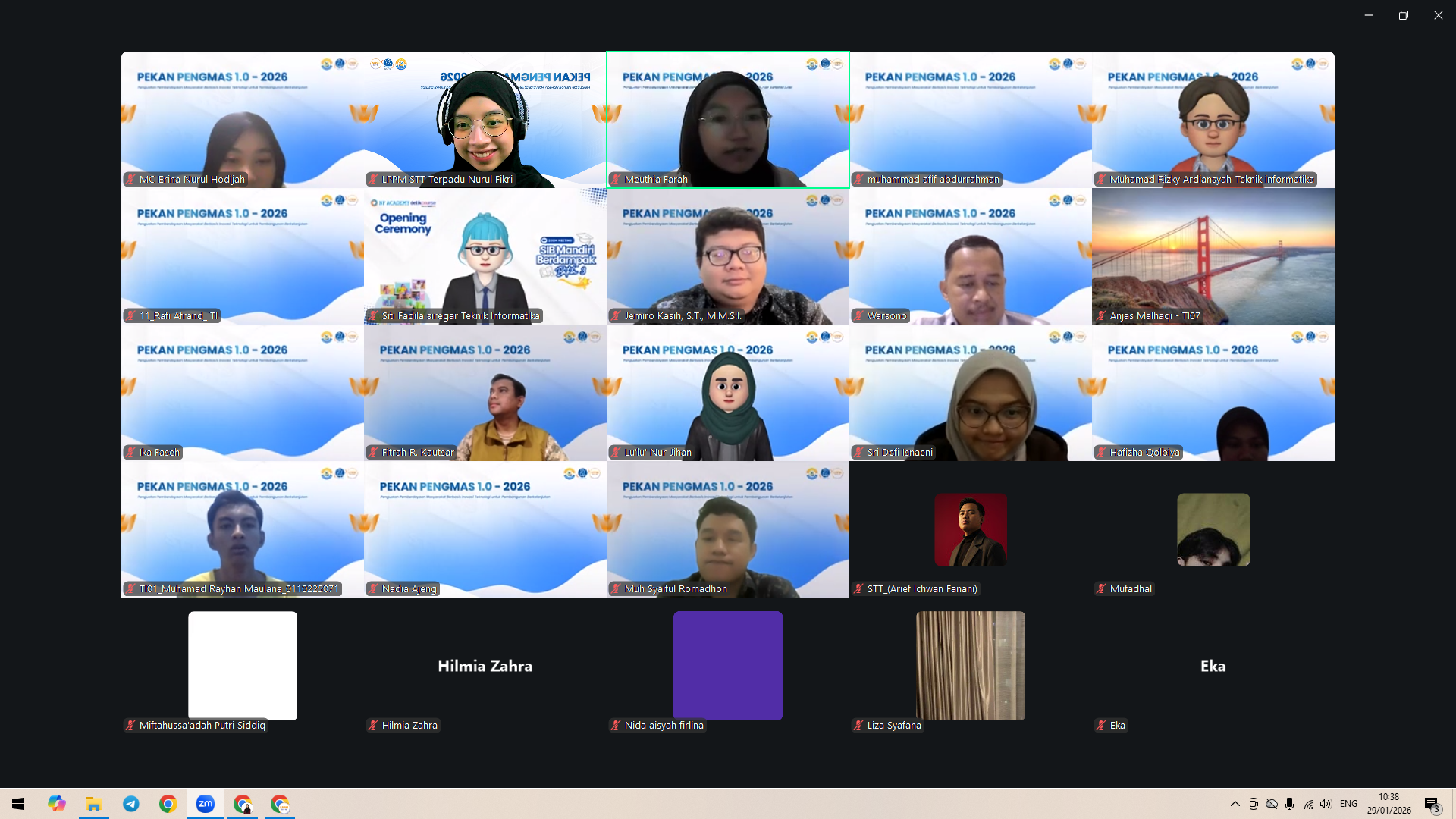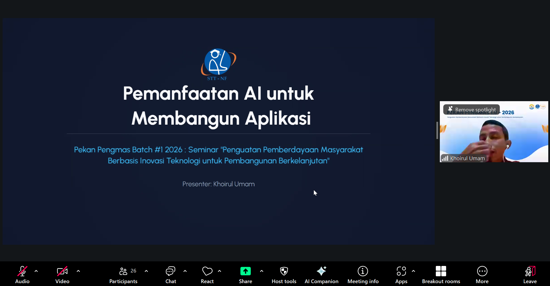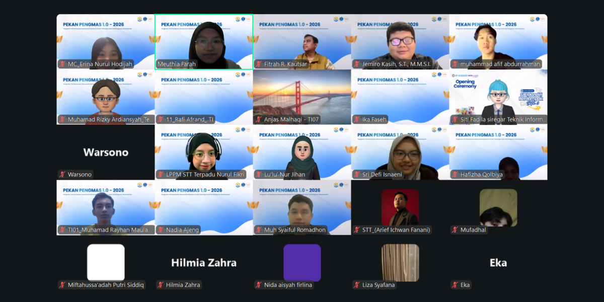 Lembaga Penelitian dan Pengabdian kepada Masyarakat (LPPM) STT Terpadu Nurul Fikri menyelenggarakan Pekan Pengabdian kepada Masyarakat (Pekan Pengmas) Batch 1 Tahun 2026 dengan tema “Penguatan Pemberdayaan Masyarakat Berbasis Inovasi Teknologi untuk Pembangunan Berkelanjutan”. Kegiatan ini dilaksanakan secara daring melalui Zoom dan disiarkan secara langsung melalui YouTube pada Senin hingga Kamis, 26–29 Januari 2026.