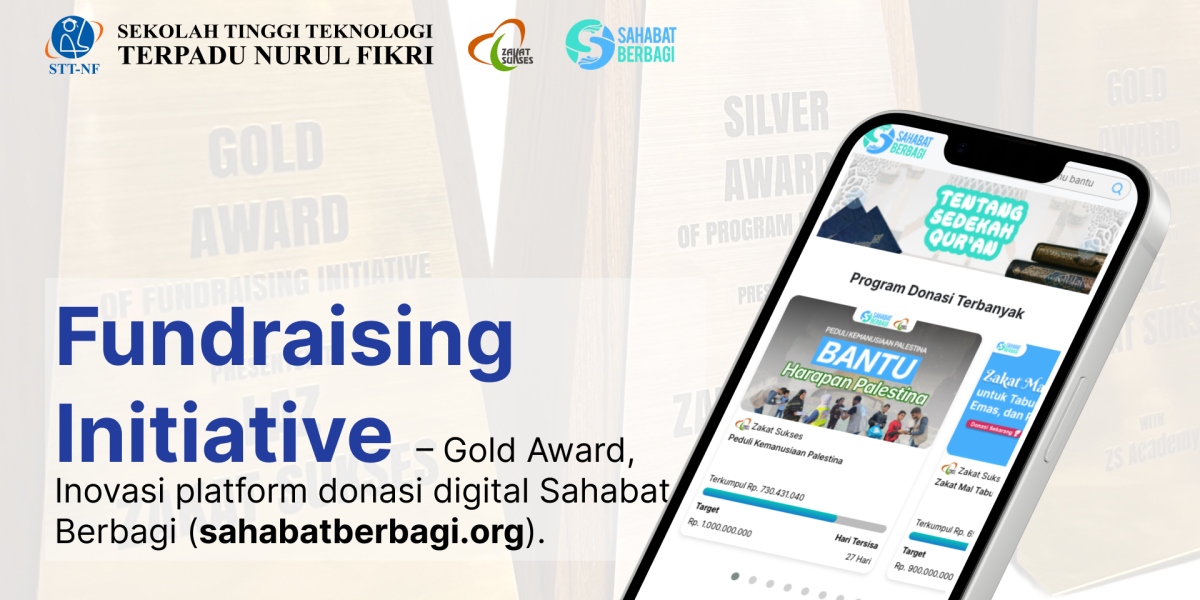 Salah satu sorotan utama adalah penghargaan pada kategori Fundraising Initiative – Gold yang diraih melalui platform Sahabat Berbagi. Platform ini merupakan hasil kerja sama strategis antara tim Penelitian dan Pengembangan STT Terpadu Nurul Fikri dan Zakat Sukses dalam menciptakan sebuah aplikasi crowdfunding yang inovatif, adaptif, dan terus berkembang, Dosen yang berperan dalam aplikasi crowdfunding ini adalah Dr. Lukman Rosyidi, M.T., M.M., Davied Wahyu wismanindra,.S.Kom., M.M., dan Amalia, S.E., M.Ak. Melalui kolaborasi ini, teknologi dan semangat filantropi disatukan dalam satu ekosistem digital yang memudahkan masyarakat untuk berdonasi kapan saja dan di mana saja, sekaligus memastikan penyaluran dana lebih tepat sasaran dan transparan.